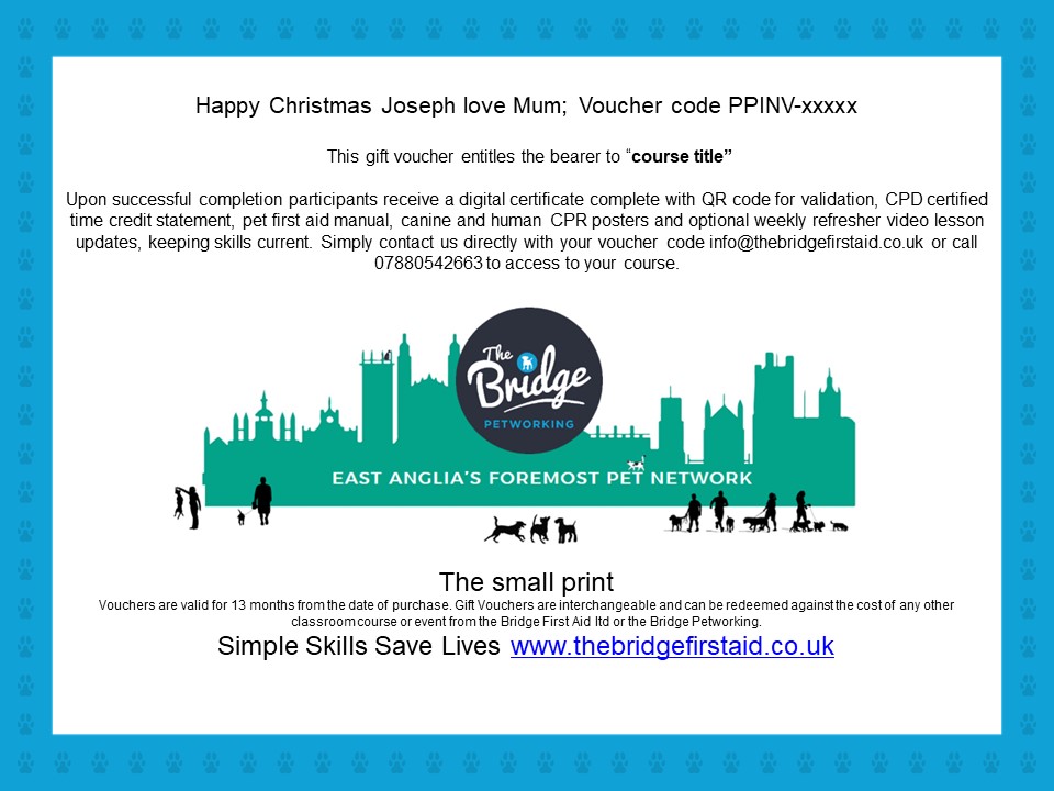 Gift vouchers are popular with animal courses but also redeemable against any of our training programmes including scheduled courses and online training. Get in touch using the contact form below with the course you would like to buy and your personal message. We will then send you an invoice and downloadable gift voucher to share.